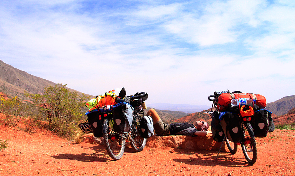Nous quittons Chilecito sous un soleil de plomb et le mercure ne cesse de grimper. Les premiers 20 kilomètres, la route descend légèrement mais arrivés à Nanogasta, la montée commence sérieusement. Nous sommes au pied de la fameuse Cuesta de Miranda, une section de la Ruta Nacional 40 qui traverse des montagnes d’un rouge flamboyant. La température frôle les 44 degrés et c’est avec la sensation d’être des steaks sur un barbecue que nous
